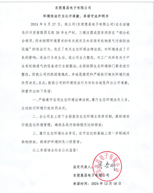 東莞惠昌電子有限公司生態環境違法行為公開道歉、承諾守法聲明書