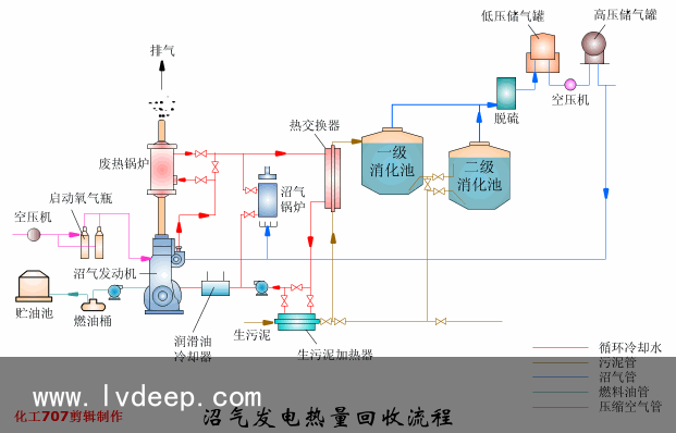 沼氣發電熱量回收流程?沼氣發電系統能積極、有效地利用沼氣,可以將沼氣中約30%的能量變為電力,40%的能量變為熱能。在污水處置懲罰廠中可利用這一熱量給消化池進行加熱。