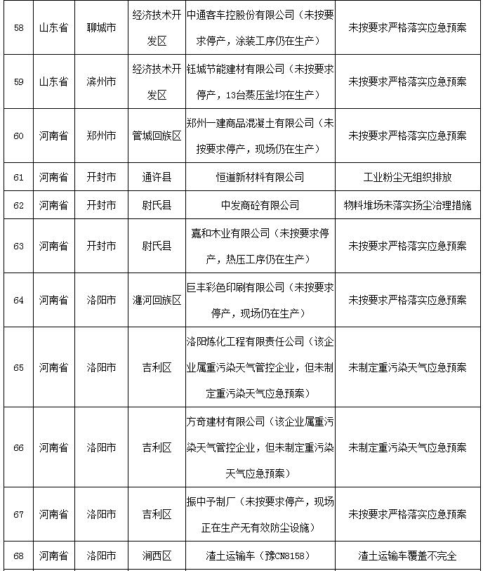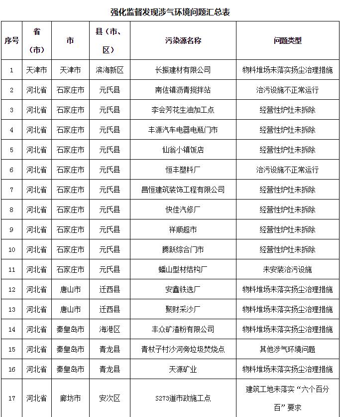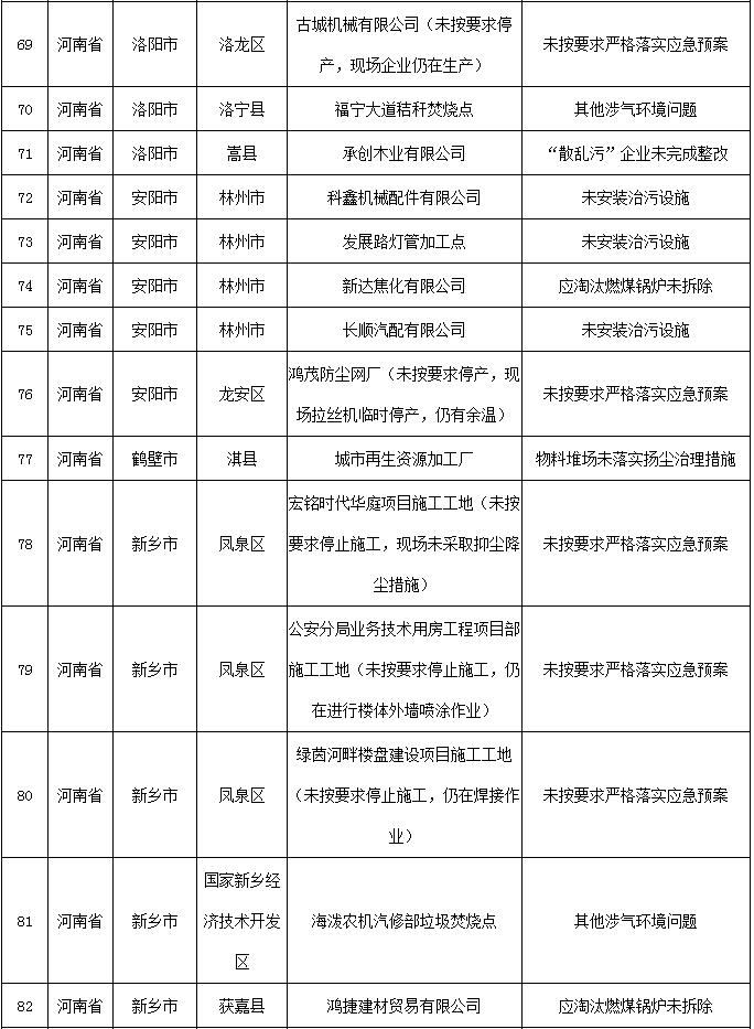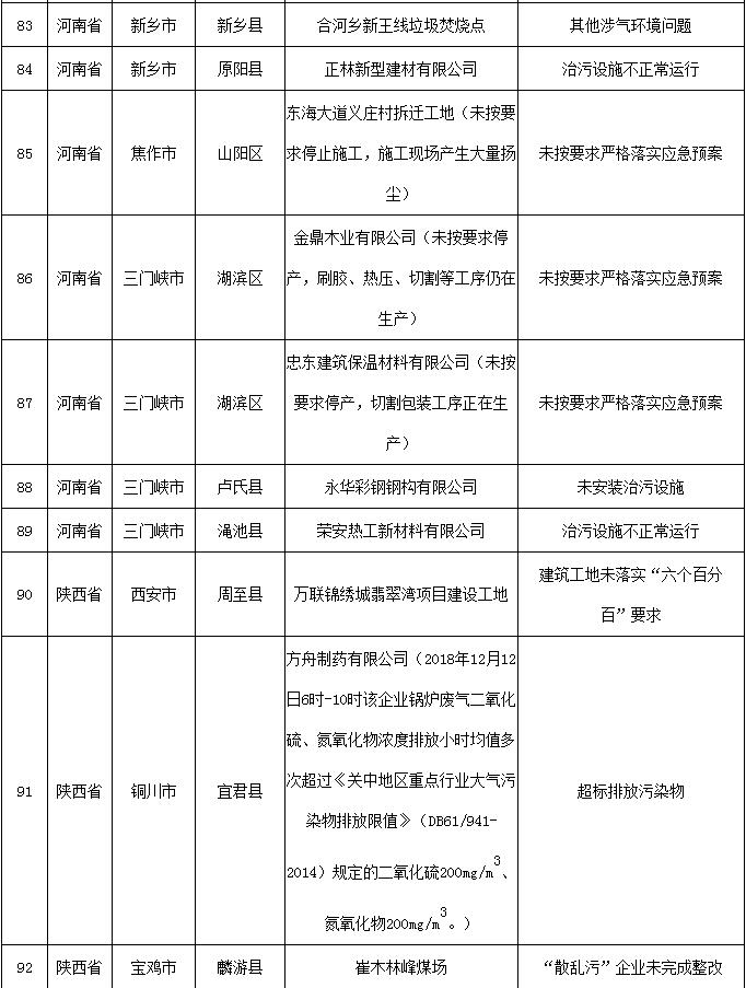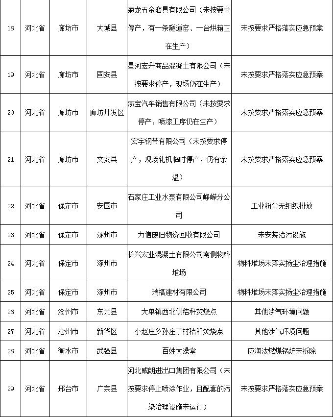2018-2019年藍(lán)天保衛(wèi)戰(zhàn)重點(diǎn)區(qū)域強(qiáng)化監(jiān)督工作繼續(xù)開展,12月13日工作組發(fā)現(xiàn)涉氣環(huán)境問(wèn)題80個(gè)(其中1家企業(yè)有2臺(tái)應(yīng)淘汰燃煤鍋爐,1家企業(yè)有2臺(tái)經(jīng)營(yíng)性爐灶),12月14日工作組發(fā)現(xiàn)未嚴(yán)格執(zhí)行重污染天氣應(yīng)急響應(yīng)問(wèn)題23個(gè)(見附表)。