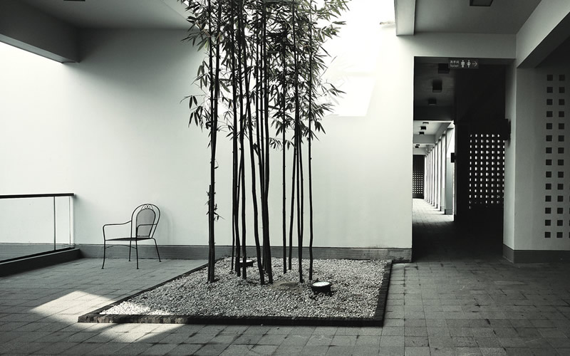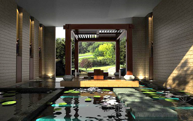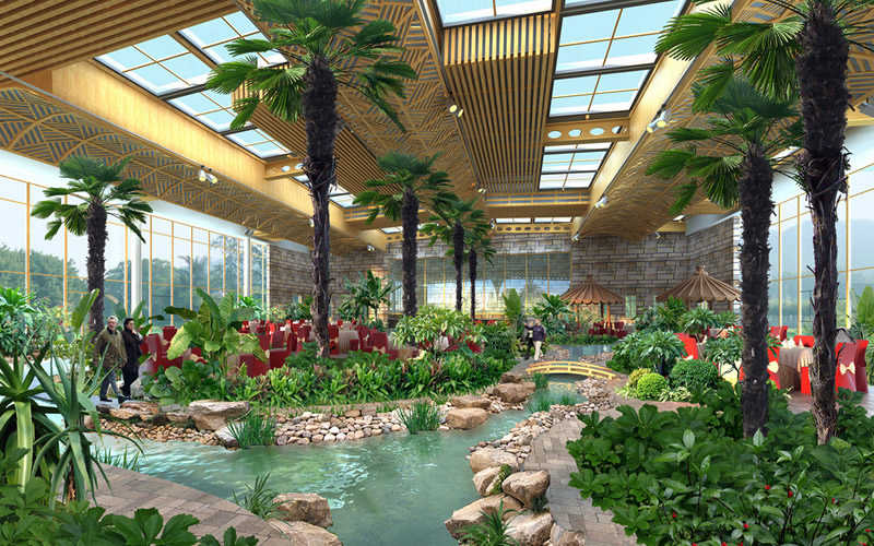 將自然景觀和人工造景的方法進行組景,在室內形成了一定的景致,改裝室內氣氛、美化室內空間在建筑的大廳中設置景觀,能使室內產生生機勃勃的氣氛,增加室內的自然氣息,借室外景色與室內園林有機地結合起來,使人們置身園林景觀中,有回歸大自然的感覺,柔化了建筑體的生硬感。